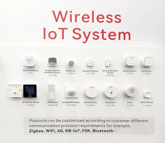 This series of products mainly adopts Zigbee wireless communication method (4G can be customized according to customer needs NB-IoT、ZigBee、WiFi、 Bluetooth, LoRa, and other communication methods are managed by the T3 gateway to manage front-end detectors such as infrared, smoke, air, temperature and humidity, door magnets, and water immersion.