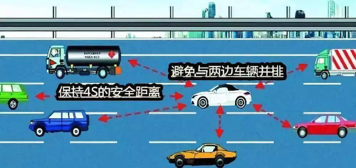 In the process of driving, the car in front may suddenly stop and the car will suddenly change lanes, so keep a safe distance of at least 4 seconds from the car in front of at least 4 seconds. At the same time, avoid the vehicle driving side by side, so that their car in front or left, right at least the side of the space, as an emergency escape area.