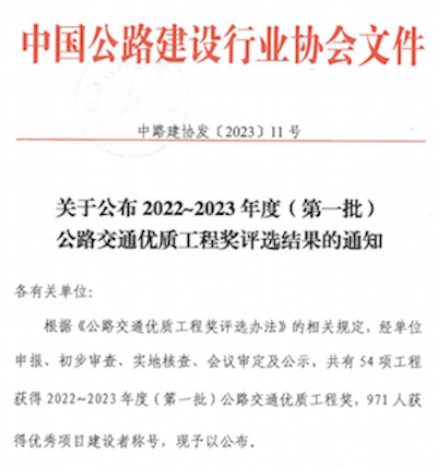 On January 13,2024, the fifth highway construction quality and highway traffic quality engineering award commendation congress held in Hubei Wuhan, by the subsidiary in Jiangsu zhongke intelligent system co., LTD. (hereinafter referred to as the "zhongke intelligent") cooperated-builing Wuzhong avenue east and south lake road expressway project, named 2022-2023 highway traffic engineering, zhongke intelligent as one of the winning project representatives attended the commendation congress.