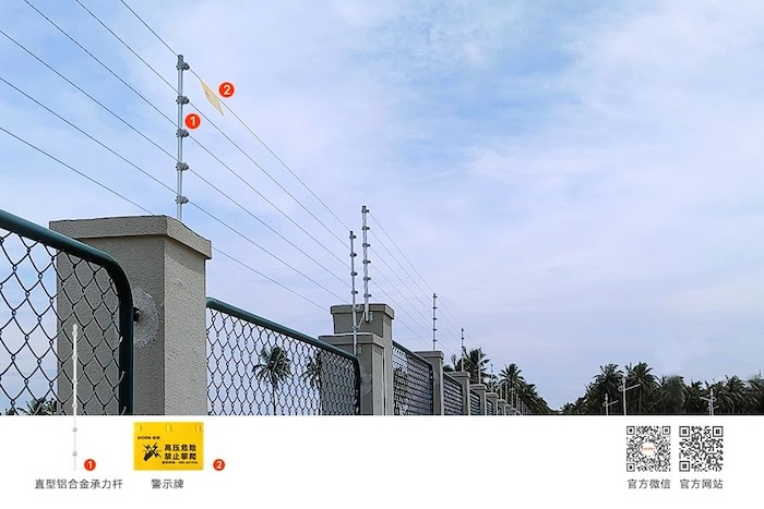 In case of forced intrusion, the electronic fence will provide a pulse high-voltage strike within the safe energy range, warning illegal intruders and shaking their ability and motivation to climb over the fence. At the same time, the system emits a high decibel sound alarm on site and is linked with other security systems (such as alarm hosts, monitoring systems, etc.) to achieve the purpose of safety obstruction.