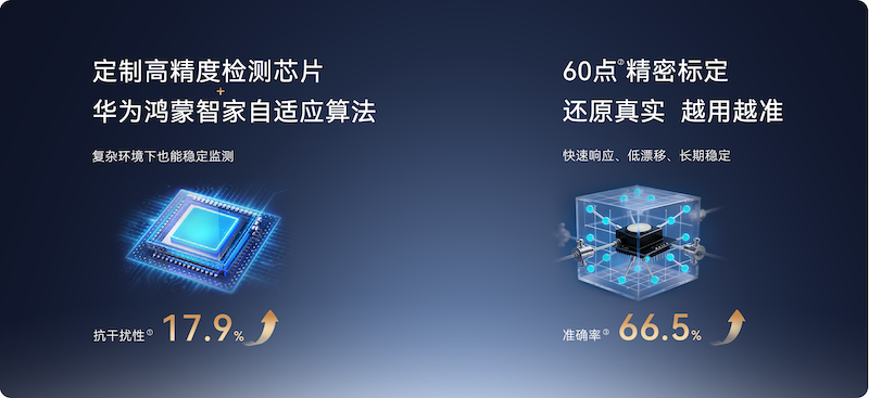 高精度檢測芯片搭載華為鴻蒙智家自適應(yīng)算法,能對每一路傳感器信號做實時補償與融合處理,保障傳感器即使處于復雜環(huán)境下也能穩(wěn)定探測,抗干擾能力提升17.9%*。