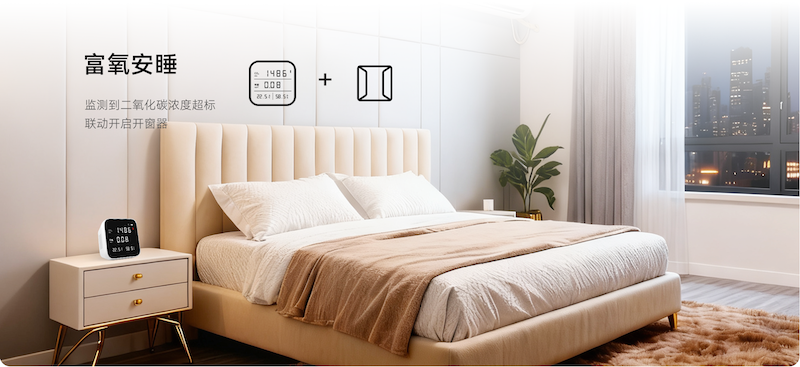 富氧安睡:當豪恩空氣質(zhì)量檢測儀監(jiān)測到二氧化碳濃度過高時,自動聯(lián)動開窗器通風,不影響睡眠,保障整夜富氧環(huán)境。