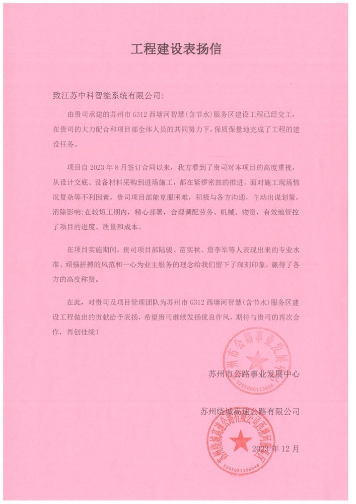 近日,蘇州市公路事業(yè)發(fā)展中心和蘇州繞城高速公路給中安科子公司中科智能發(fā)來(lái)聯(lián)名表?yè)P(yáng)信,對(duì)中科智能在“蘇州市G312西塘河智慧(含節(jié)水)服務(wù)區(qū)建設(shè)工程G312-ZHFWQ標(biāo)段”項(xiàng)目中的整體工作予以認(rèn)可,尤其是對(duì)項(xiàng)目部全體成員在項(xiàng)目實(shí)施過(guò)程中專業(yè)水準(zhǔn)、頑強(qiáng)拼搏的風(fēng)范和一心為業(yè)主服務(wù)的理念表示稱贊。