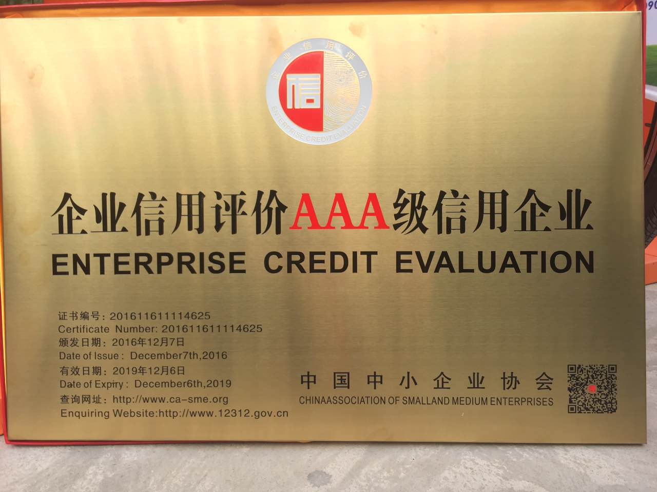 榮獲國家商務(wù)部“企業(yè)信用3A級” 評價