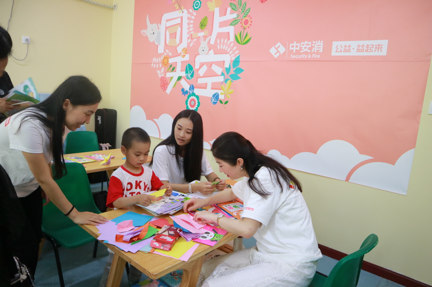 中安科愛心團(tuán)隊(duì)的志愿者們陪孩子們做各種手工活動(dòng)