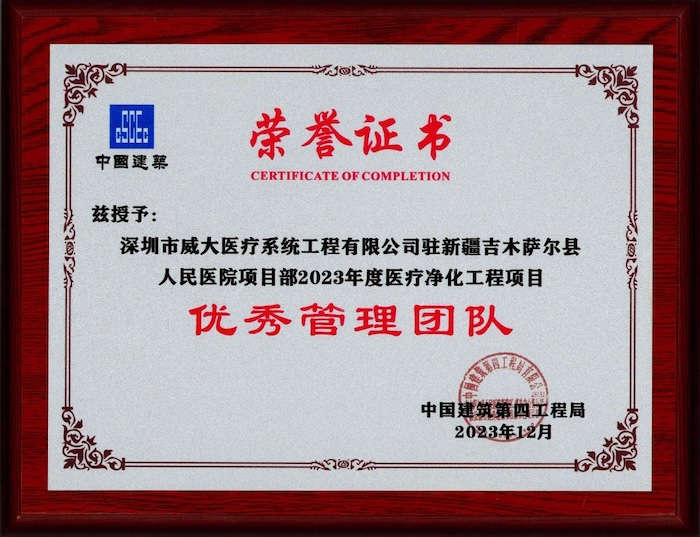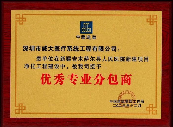 近日,中安科子公司深圳市威大醫(yī)療系統(tǒng)工程有限公司在承建的新疆吉木薩爾縣人民醫(yī)院新建項(xiàng)目凈化工程中,被總包單位中國建筑第四工程局授予“優(yōu)秀專業(yè)分包商”的榮譽(yù)稱號;同時(shí),公司駐新疆吉木薩爾縣人民醫(yī)院項(xiàng)目部,也在2023年度醫(yī)療凈化工程項(xiàng)目中,被評為“優(yōu)秀管理團(tuán)隊(duì)”。