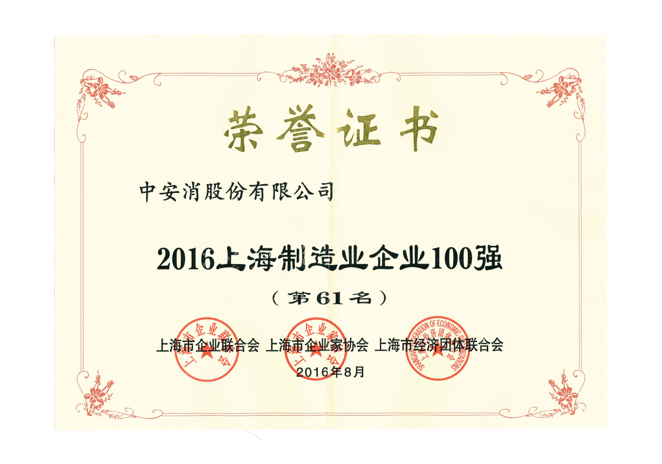 近日,2016上海企業(yè)百強(qiáng)榜正式出爐,中安消科股份有限公司(以下簡(jiǎn)稱“中安消”)榮登2016上海民營(yíng)企業(yè)100強(qiáng)榜單、2016上海制造業(yè)企業(yè)100強(qiáng)榜單。市政府周波副市長(zhǎng)、市發(fā)改委葛大維副主任等領(lǐng)導(dǎo)出席榜單發(fā)布會(huì)并為獲獎(jiǎng)企業(yè)頒獎(jiǎng)。